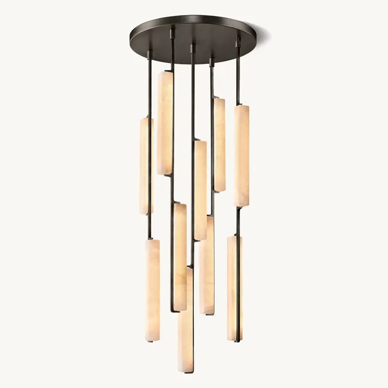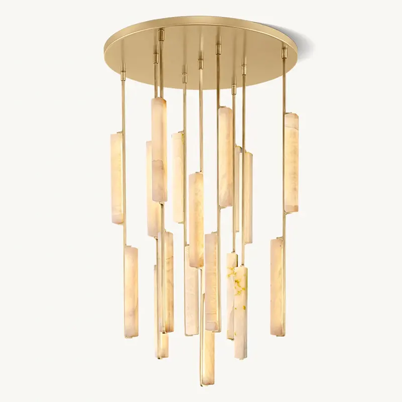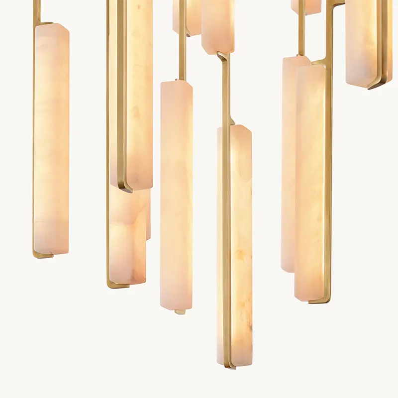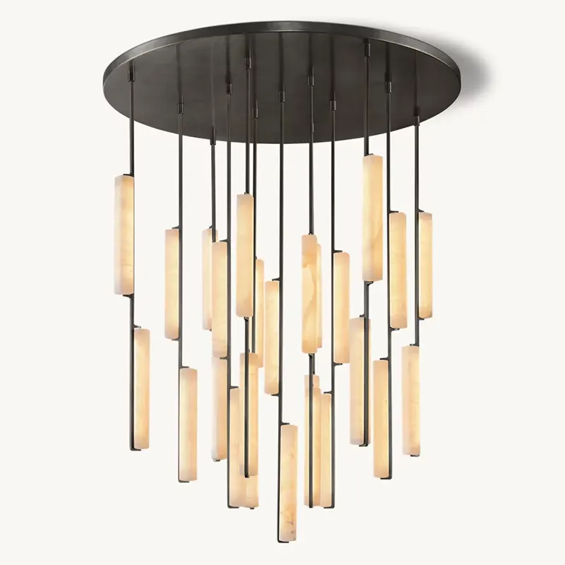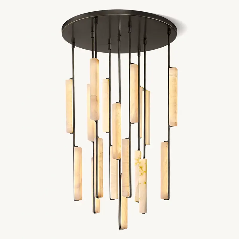 Capturing the spirit of 1960s Italian minimalism, Audubon appears to cascade from above with 26 prisms of marble alabaster on vertical brass finish drops. At once striking and restrained, the collection by Joseph Jeup evokes the warmth of candlelight with elongated LEDs that shed beautiful light through the translucent stone.