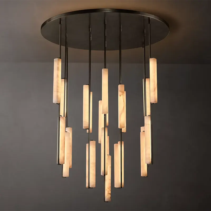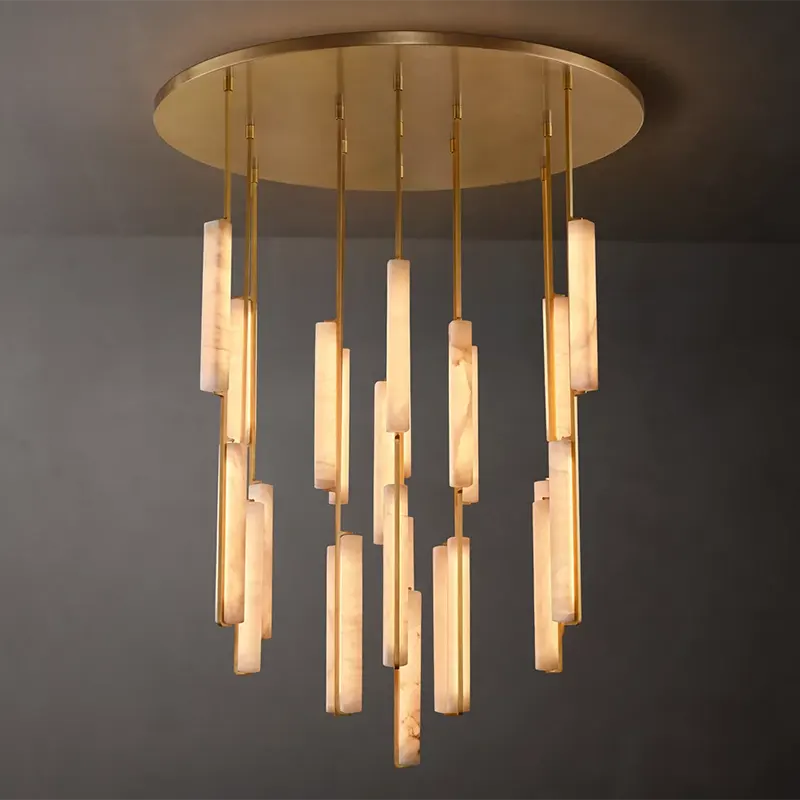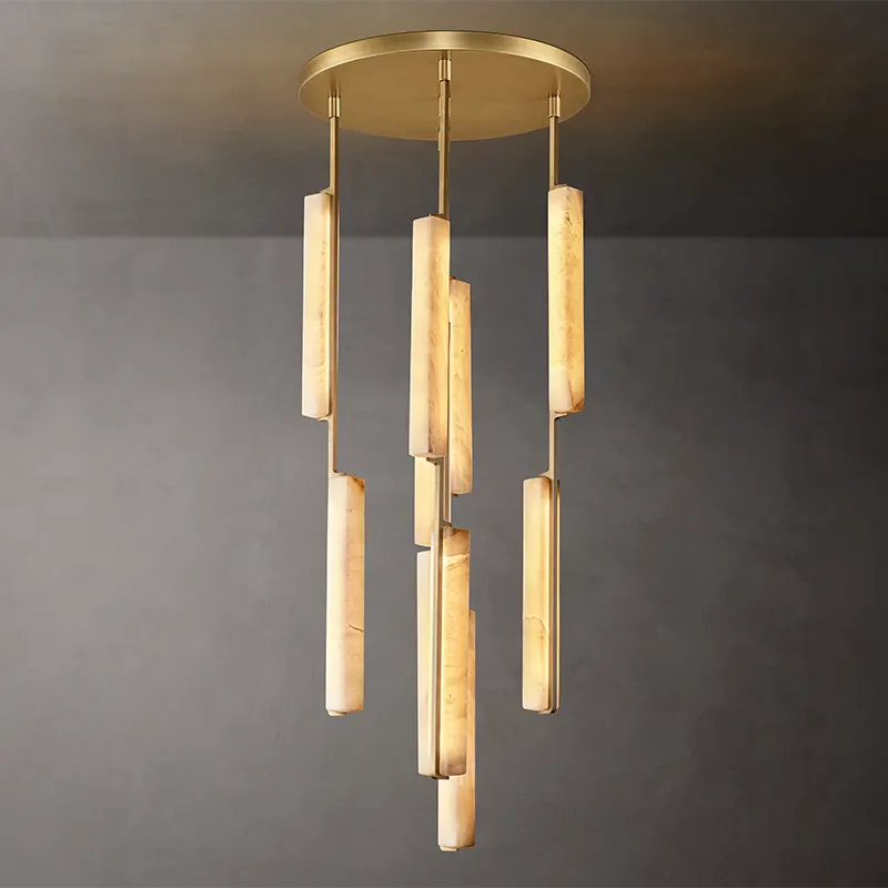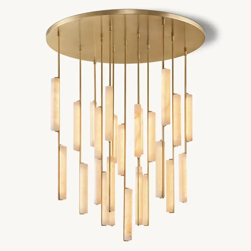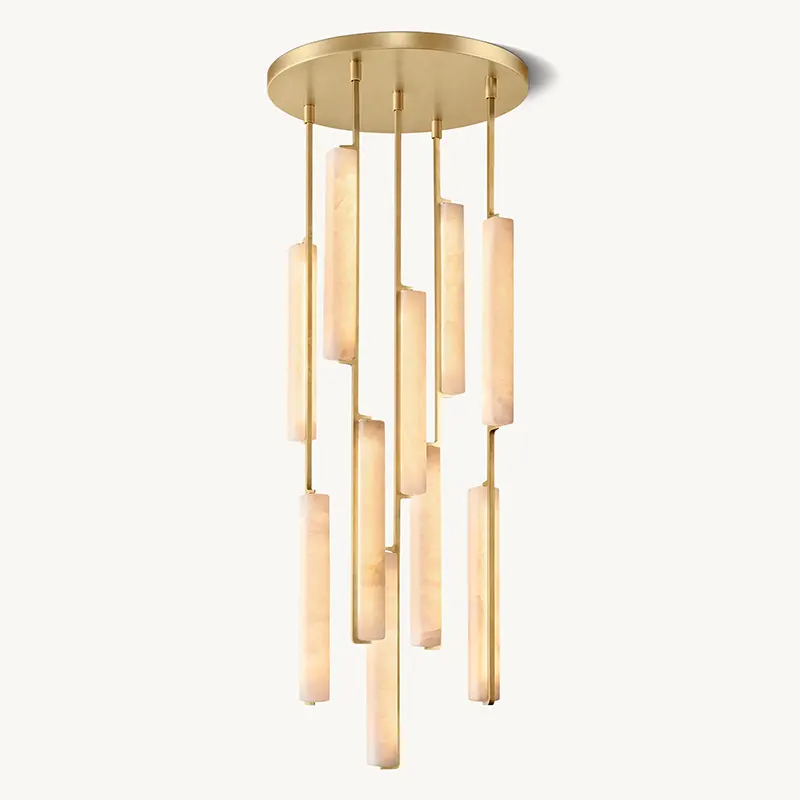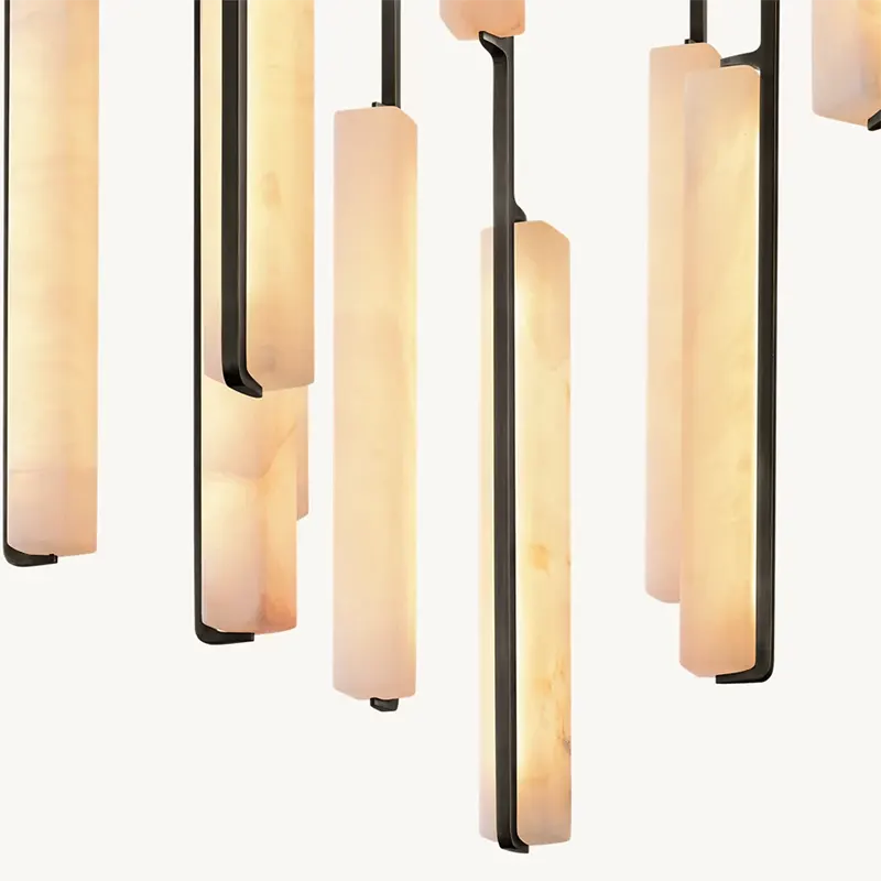 Capturing the spirit of 1960s Italian minimalism, Audubon appears to cascade from above with 26 prisms of marble alabaster on vertical brass finish drops. At once striking and restrained, the collection by Joseph Jeup evokes the warmth of candlelight with elongated LEDs that shed beautiful light through the translucent stone.