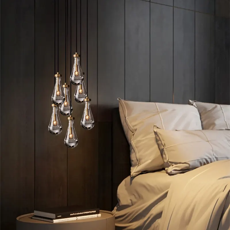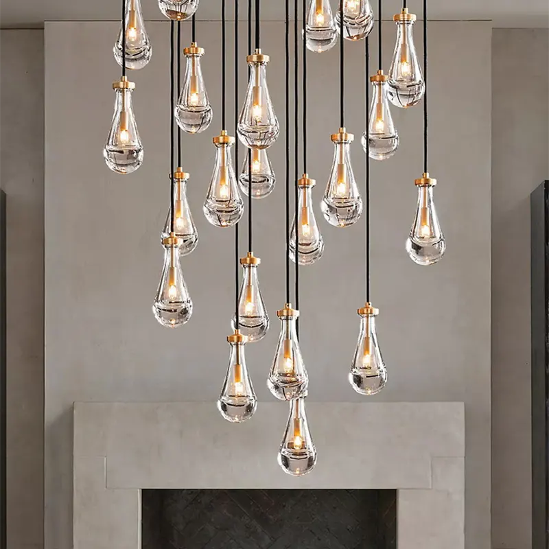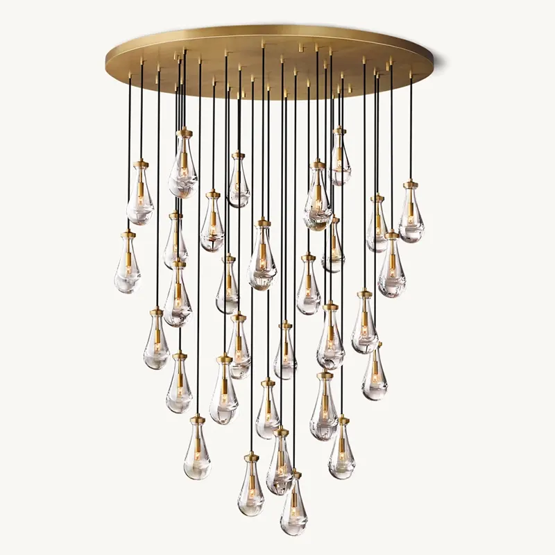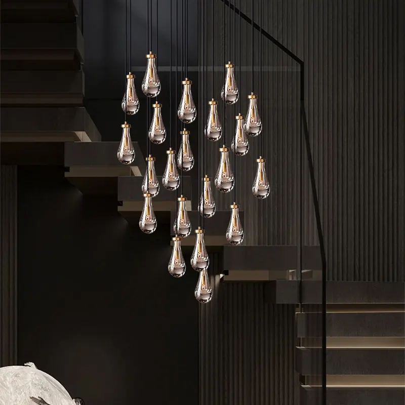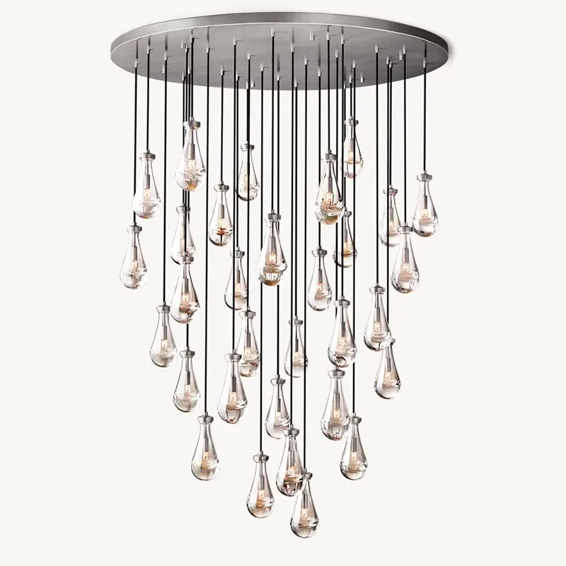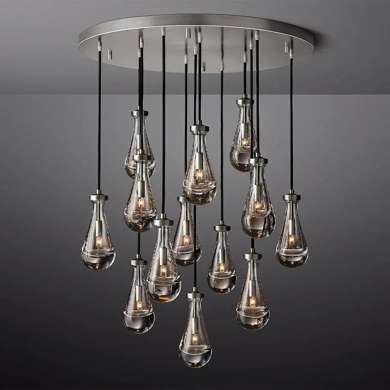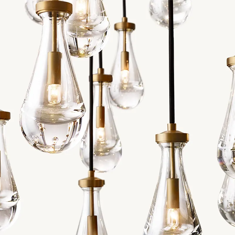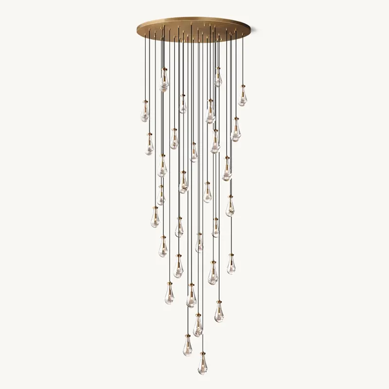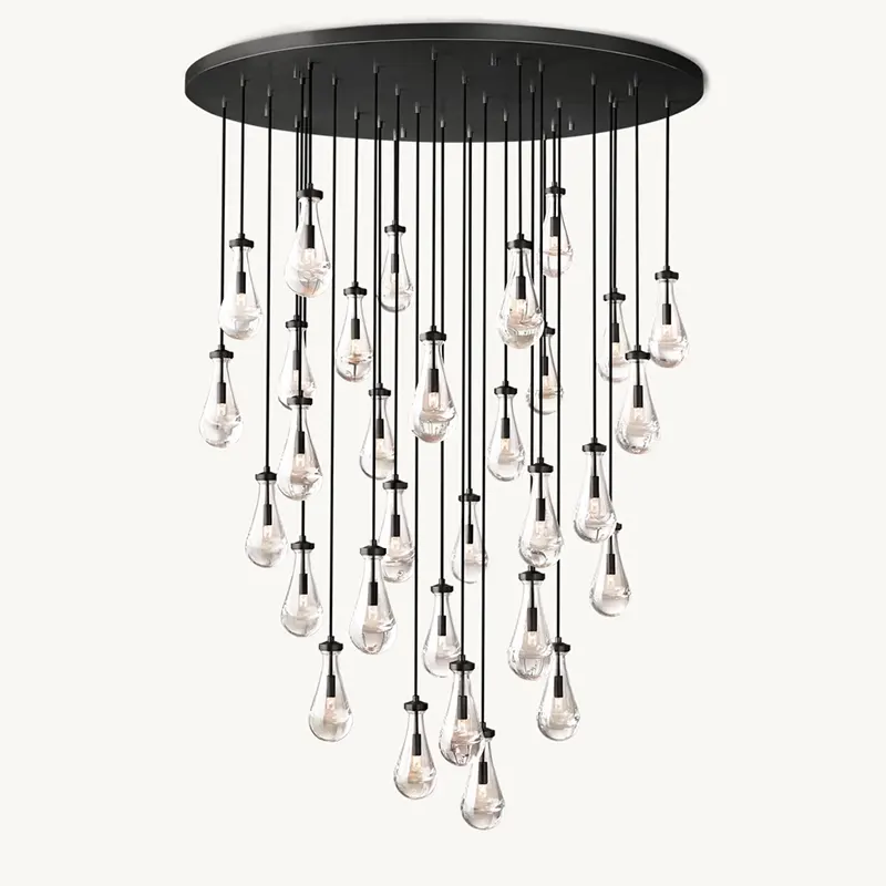 The Raindrop Chandelier immerses viewers in an ever-changing pattern of expansion and contraction, like the rhythm of a rainstorm itself. Blown glass droplets are suspended from thin black ropes, entwined with light bulbs, creating the illusion of underwater lighting and casting shimmering ripples across the ceiling and walls.