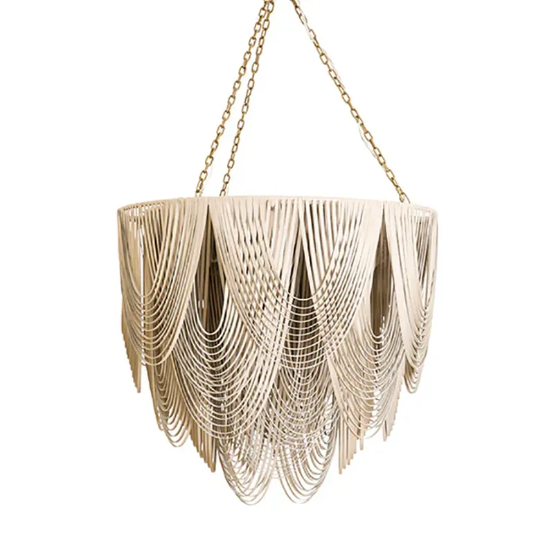 Perhaps the most unexpected textile for a light fixture, the leather Whisper Chandelier is handcrafted with swags of leather layered in graceful arcs for a stunning-yet- natural look. The ambient light from within the fixture provides a soft glow.