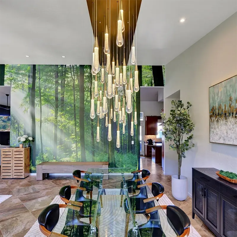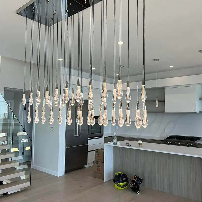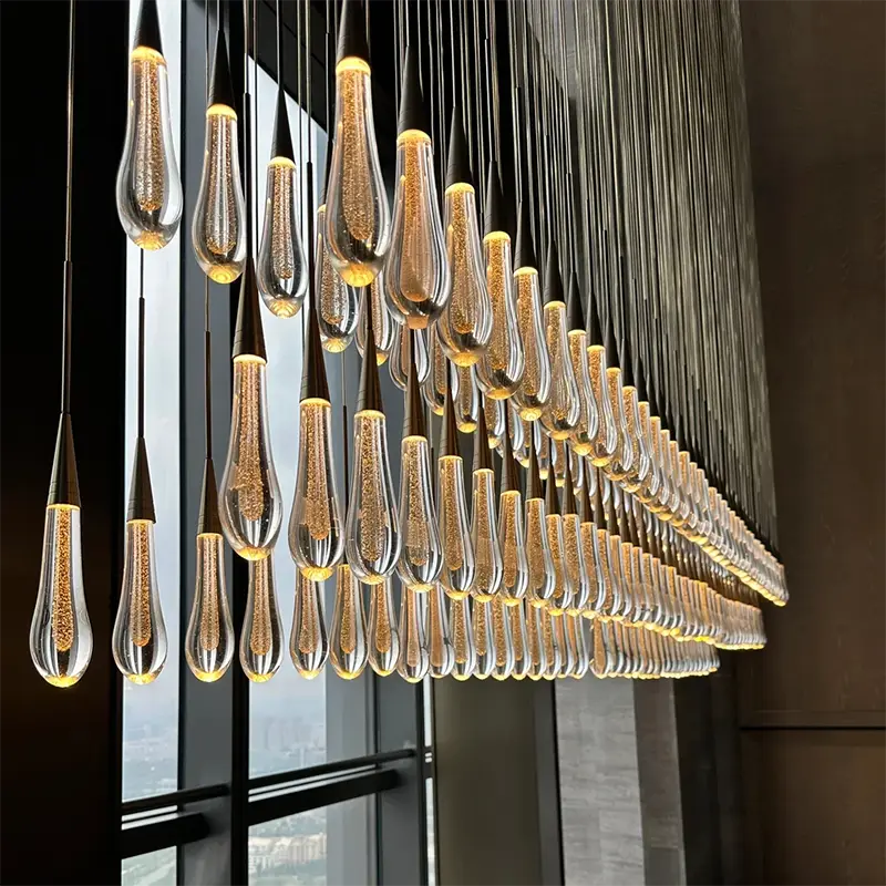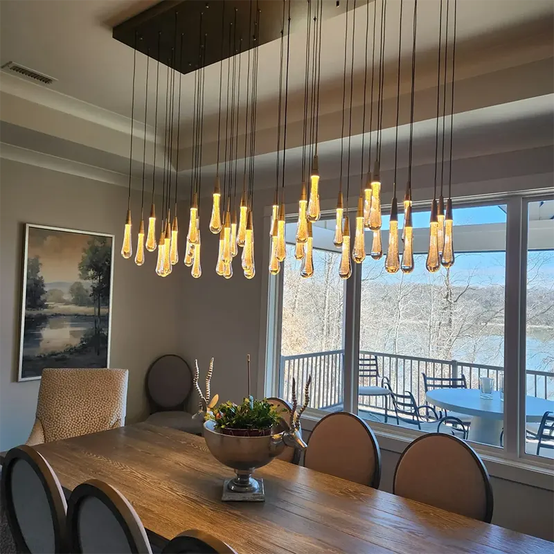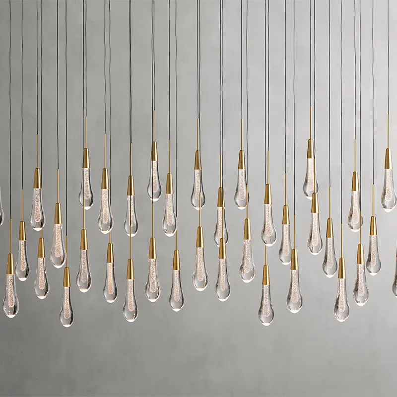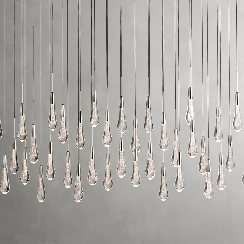 Soltaire Linear Raindrop Chandelier collection features adjustable black PVC cords cascading into integrated LED lights handcrafted from seeded glass to mimic the look of falling raindrops.